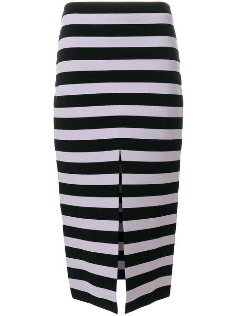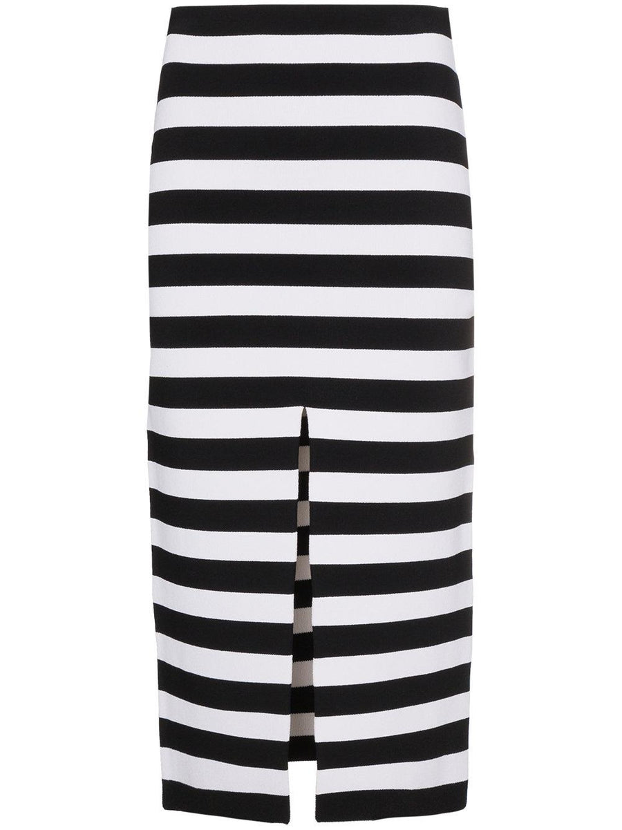 Crafted from a handcrafted combination of Italian viscose and Japanese lycra yarns, the Stripe Knit Pencil Skirt pays tribute to the French codes in the collection with Breton-style striping.